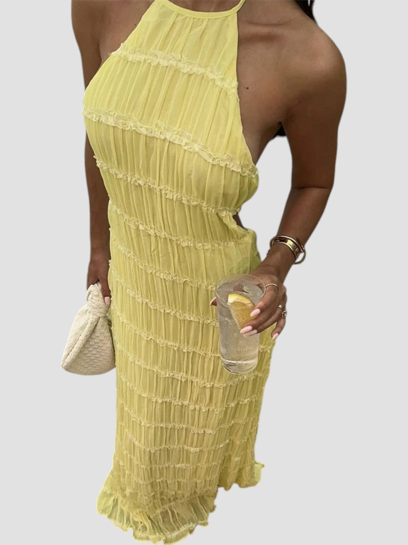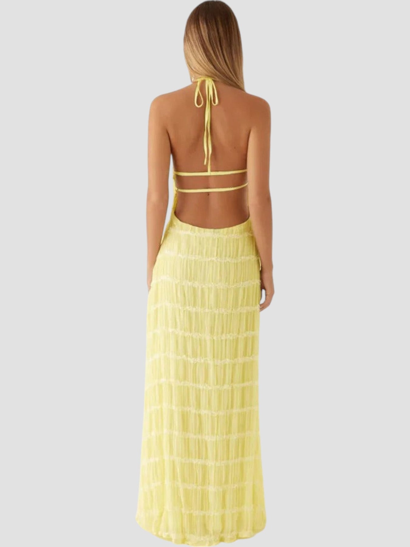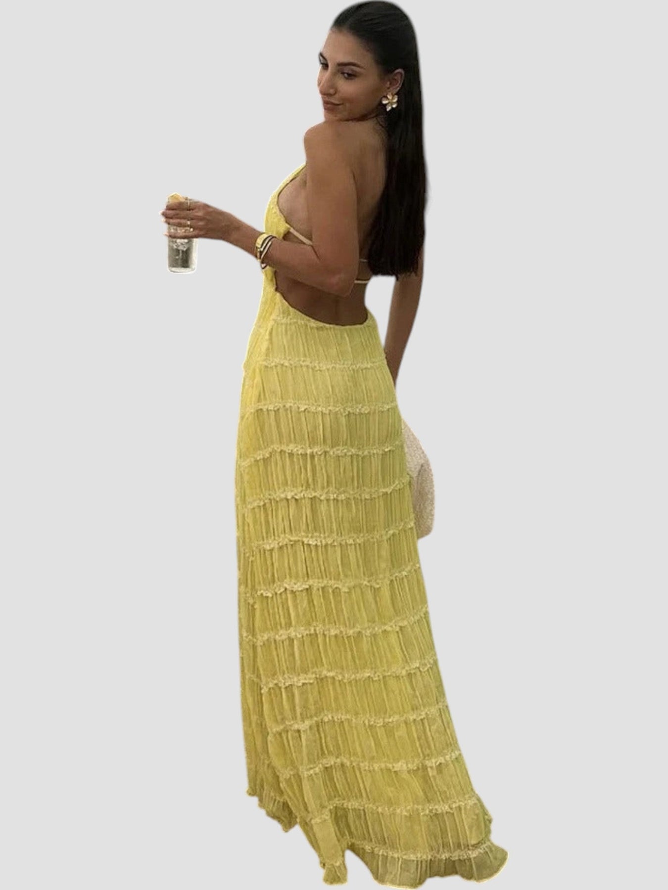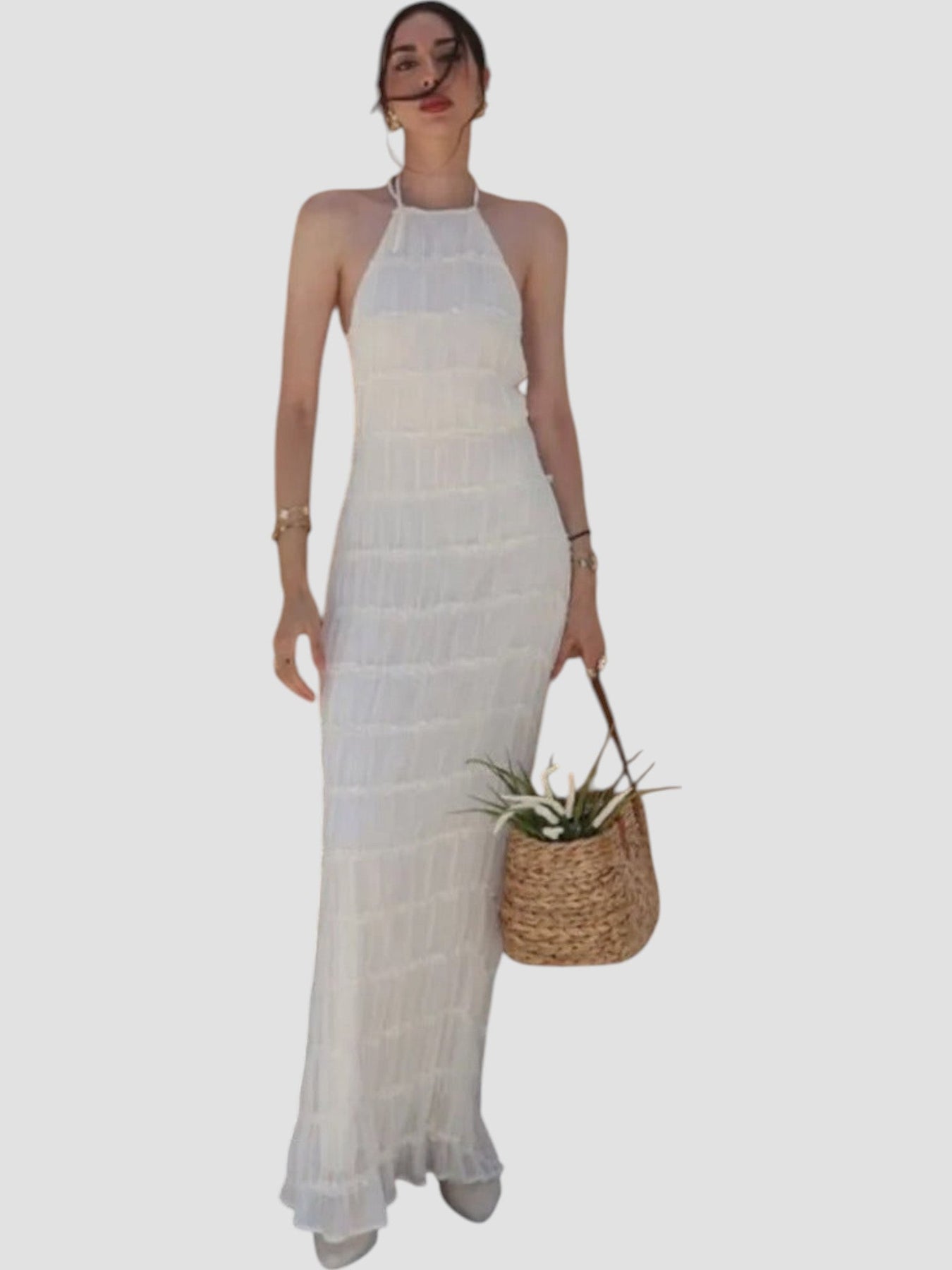 Soraya è un abito lungo e arioso che valorizza la silhouette con uno scollo all’americana sofisticato e un elegante dettaglio sulla schiena scoperta. La struttura a strati dona movimento ad ogni passo, mentre il tessuto traspirante lo rende perfetto per le occasioni estive.