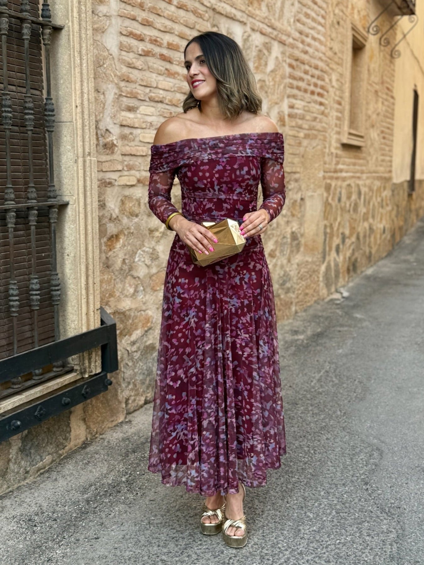 La gonna midi svasata e le maniche semitrasparenti rendono questo abito la scelta perfetta per matrimoni, cene ed eventi speciali.